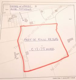 C12.75 acres, part of folio KE3486, comprising cottage (in ruins), 3 span shed, all part of one field, most of which was in tillage last year. There's good access, (3 entrances), planning permission for a dwelling may be possible, for those proving a local area need