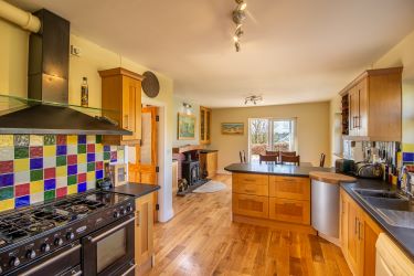 • Kitchen/Living Room: Solid Oak Floor, Fitted kitchen with wall & floor units. Rangemaster 5 burner gas hob, electric oven, extractor, American Fridge Freezer. Solid fuel stove (heats water & radiator) built in cabinets, patio doors to garden.
