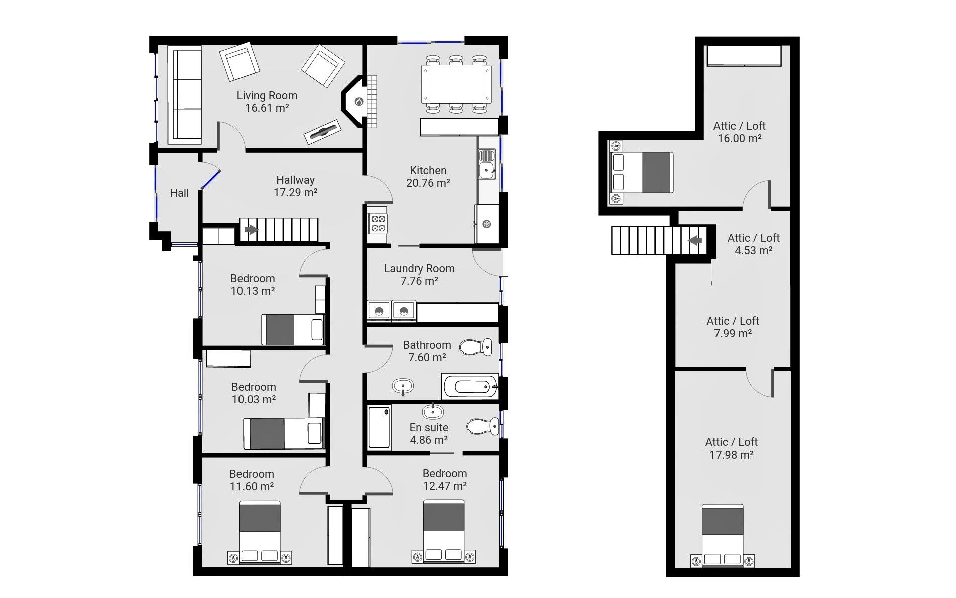 • Swedish stair to storage area currently used as 2 bedrooms, home office.